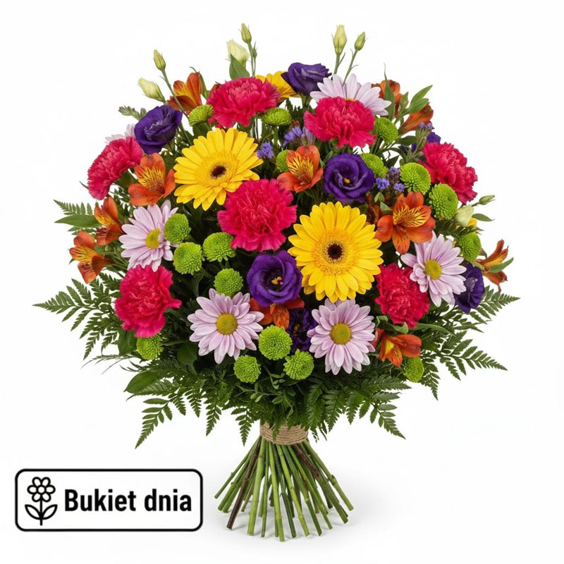 Bukiet Dnia to świeża kompozycja kwiatowa przygotowywana każdego dnia przez lokalną florystkę. Każdy bukiet tworzony jest z aktualnie dostępnych kwiatów, dobranych w spójną całość. W bukiecie wykorzystywane są kwiaty sezonowe i całoroczne, co pozwala uzyskać estetyczny i trwały efekt. Bukiet Dnia to doskonały wybór na prezent lub miłą niespodziankę. Zamów Bukiet Dnia z dostawą na terenie Bydgoszczy i pozwól nam zadbać o jakość realizacji.