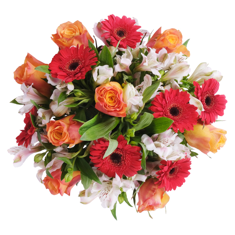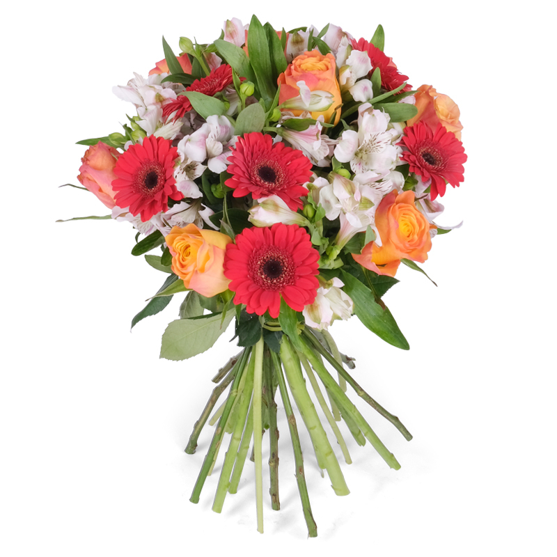 Zawsze świeże kwiaty Damska kompozycja łącząca siłę z delikatnością. Róże przyciągają wzrok swoją formą, gerbery dodają charakteru i energii, alstromerie równoważą intensywność subtelnymi akcentami. Bukiet pełen życia, budzący uśmiech na twarzy każdej osoby, która na niego spojrzy.